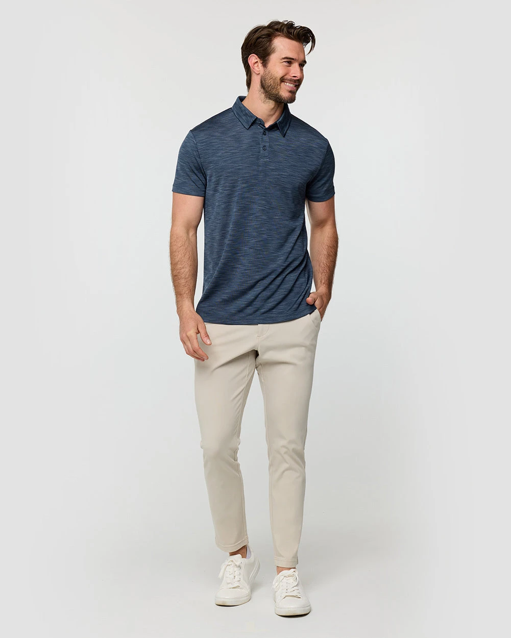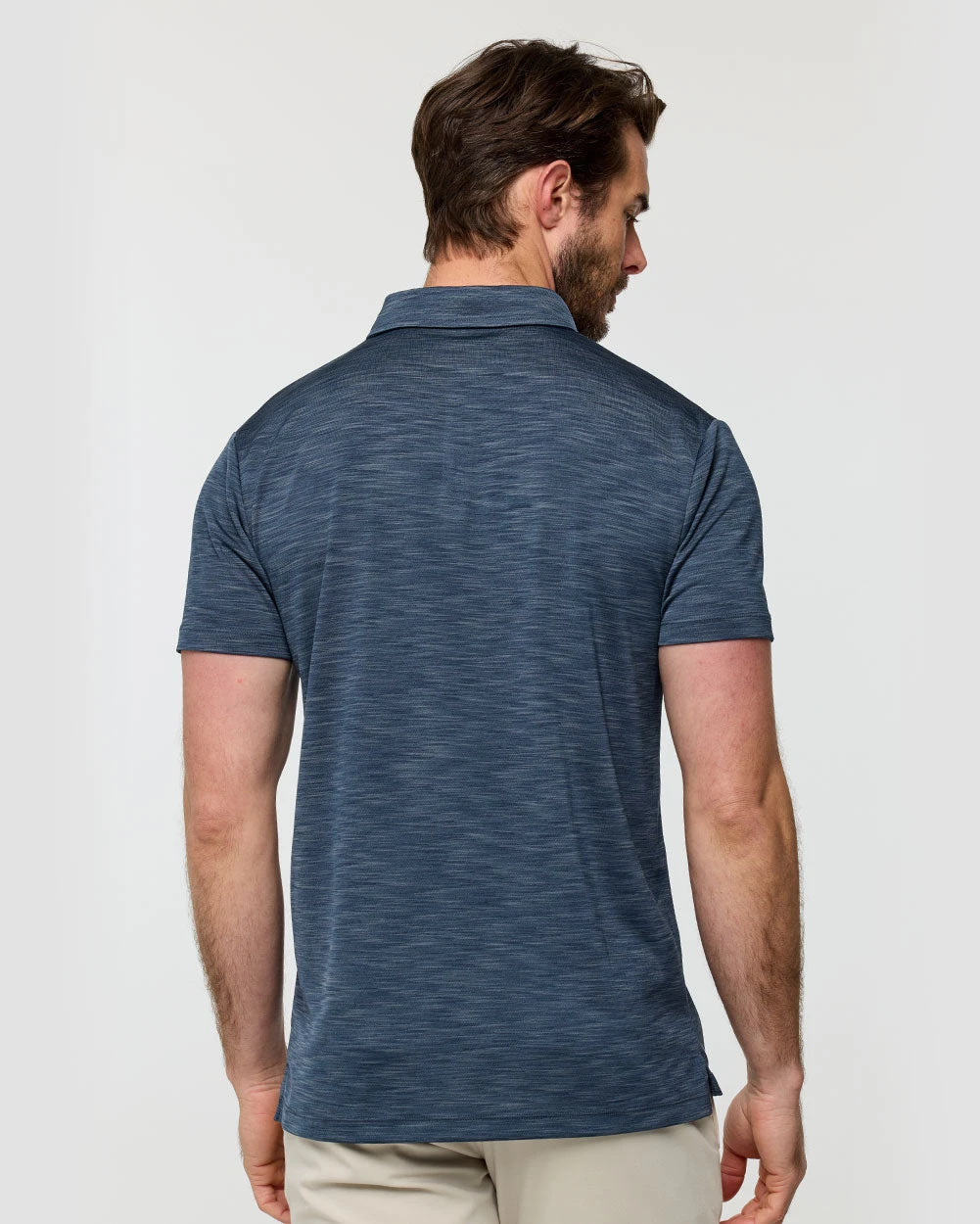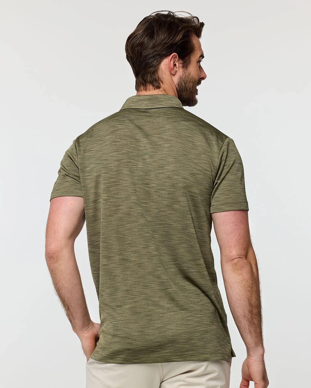 Our Performance Polo features an athletic cut made for the course. It is fitted in the arms and shoulders, with a roomy drape through the mid-section and the perfect length to look good tucked or not.ย
